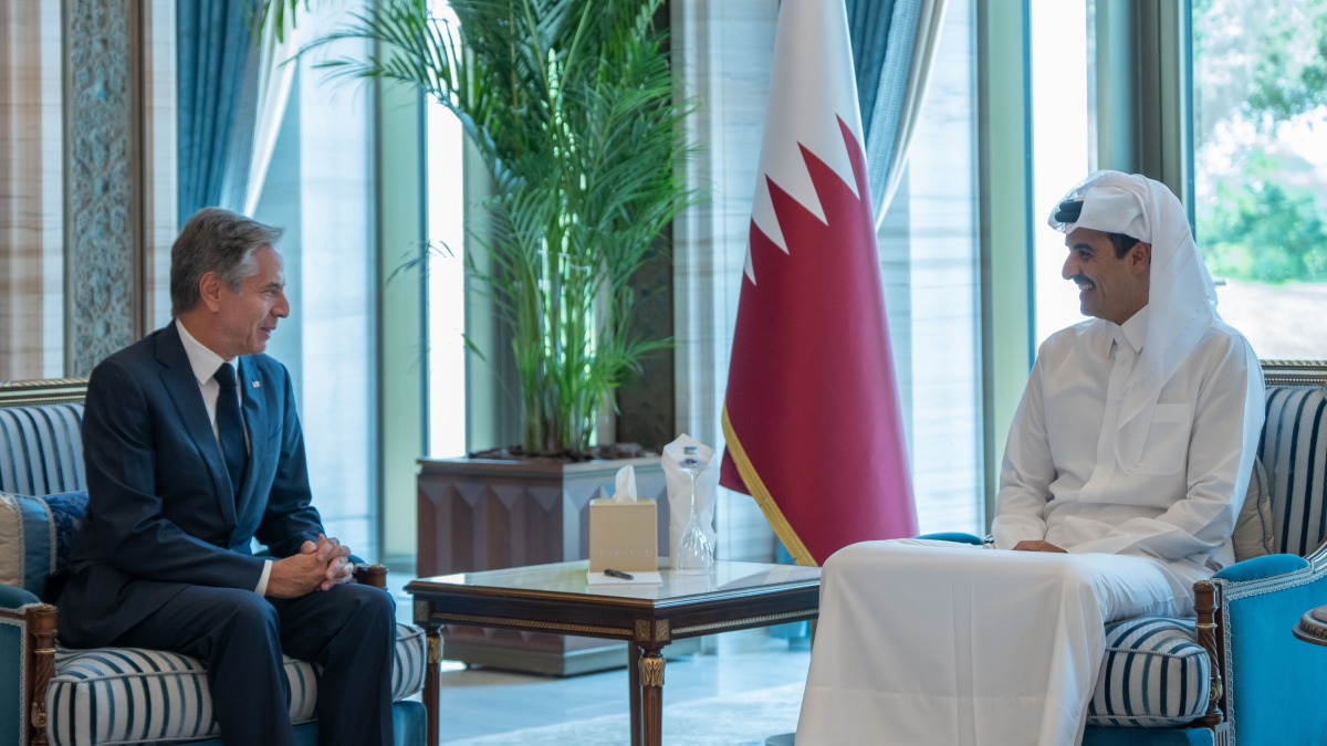 Doha, Qatar: The Amir His Highness Sheikh Tamim bin Hamad Al Thani received today at his office in Lusail Palace, Secretary of State of the friendly United States of America HE Anthony Blinken and his accompanying delegation.