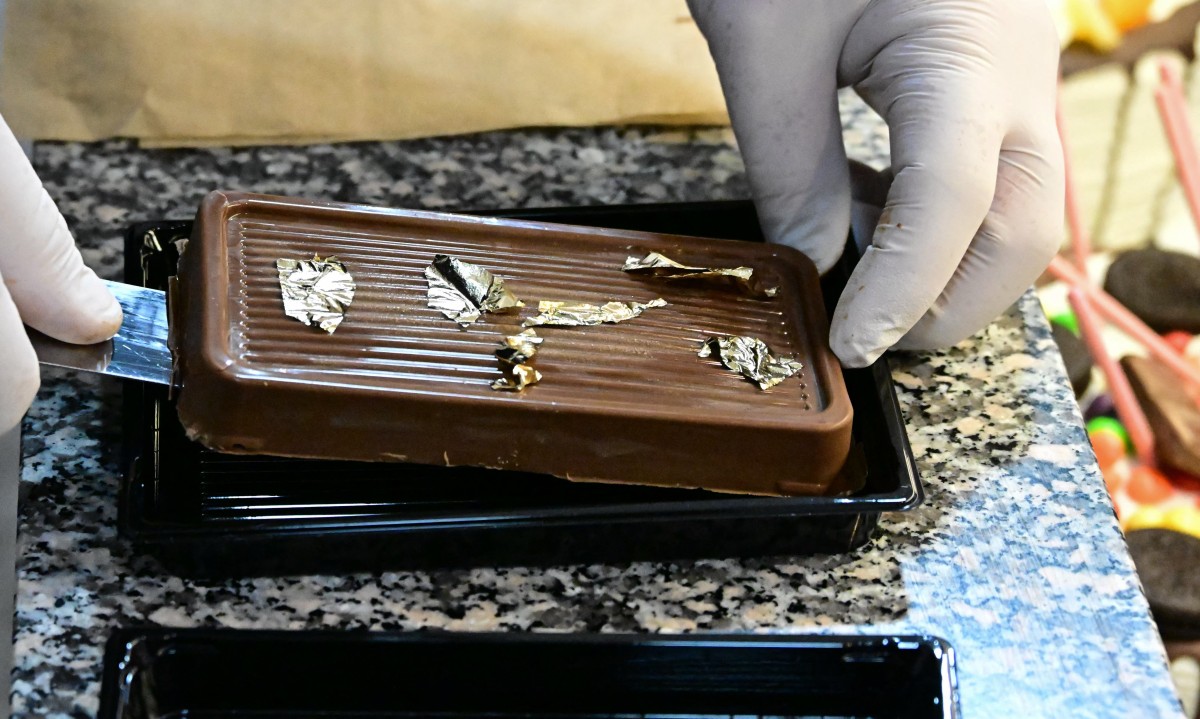 Shop owner Ali Fakhro presents a bar of Dubai chocolate with gold leaf he made at his Abu Khaled Sweets oriental pastry shop in Berlin's Wedding district on November 14, 2024. Photo by Tobias SCHWARZ / AFP.