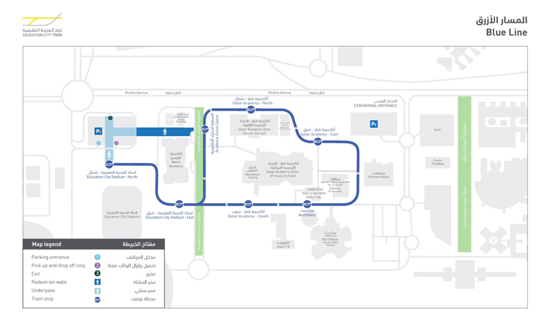 The Blue Line of the Education City Tram with seven stops on its route serves Education City Stadium, Qatar Academy and VCUarts Qatar.