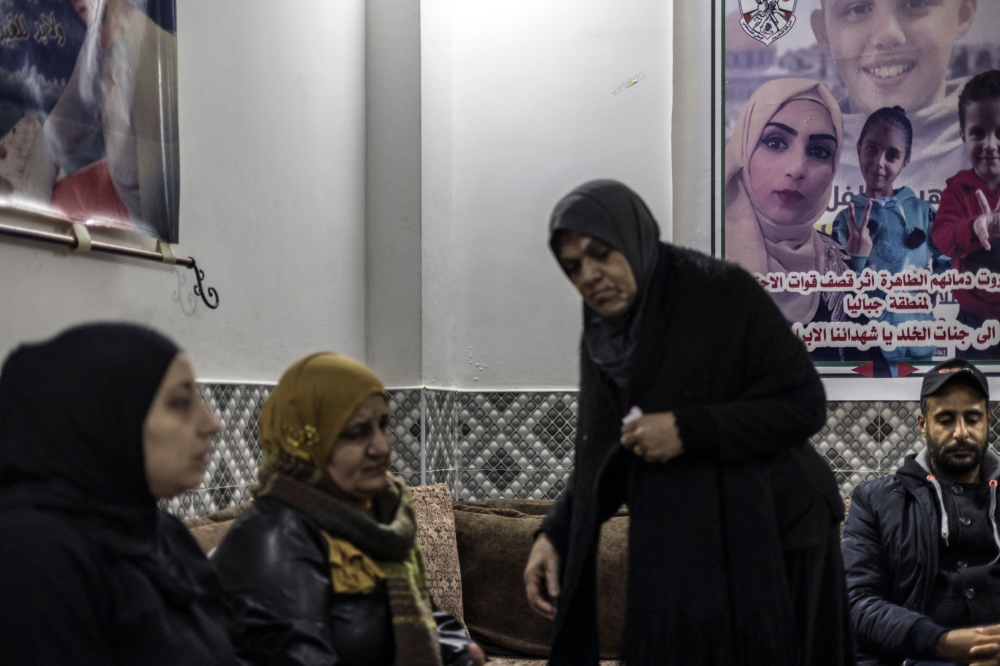 Ghada Marei, mother of 27-year-old Leena Marei (L on the poster) who was killed in Gaza December 10 with her two children Adam (R on the poster) and Layan (L on the poster), stands next to relatives at their home in the Jenin refugee camp, in the city of Jenin in the Israeli occupied West Bank, on December 23, 2023. (Photo by MARCO LONGARI / AFP)