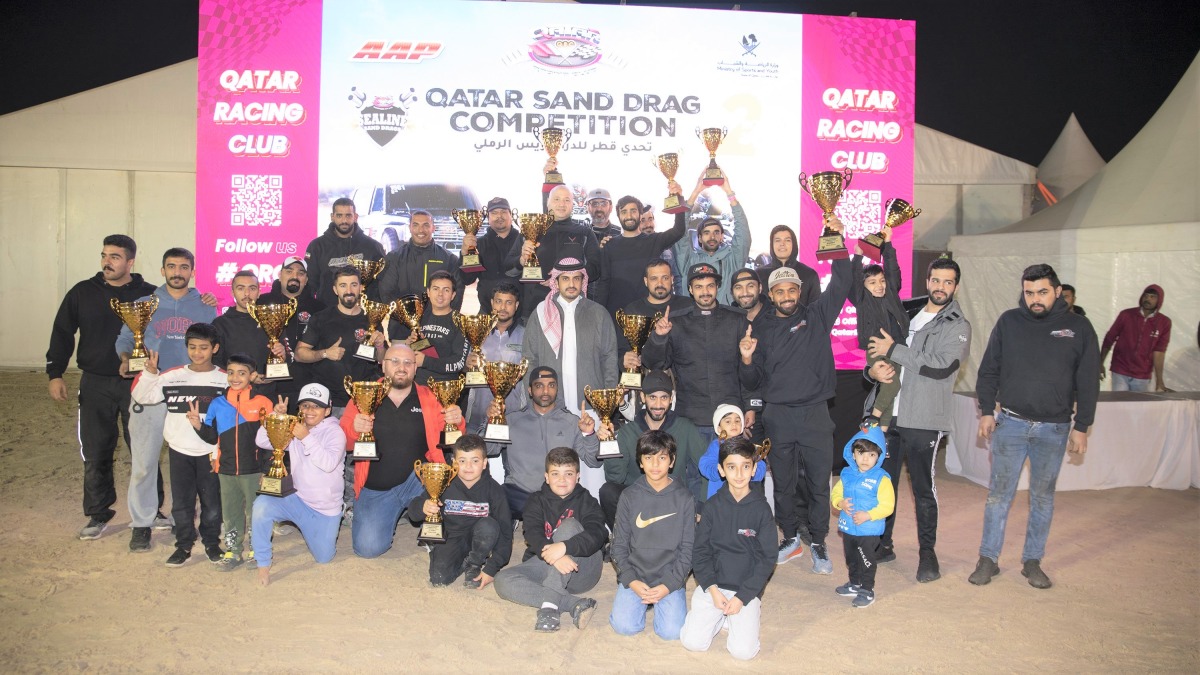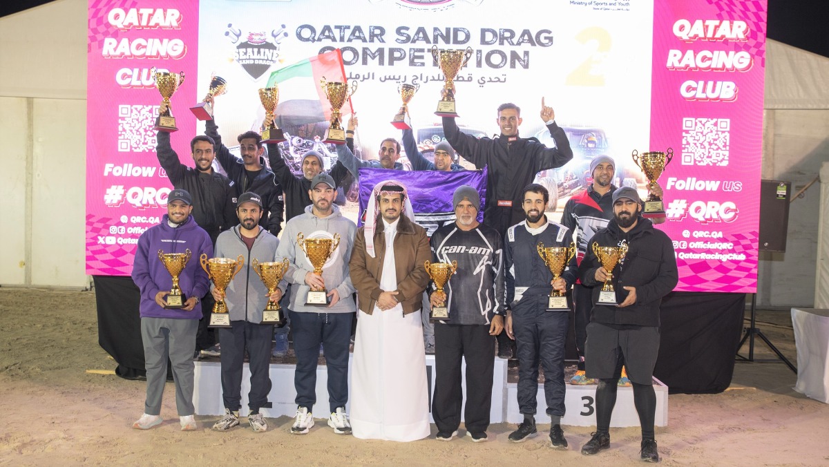 QRC Director Sheikh Jabor bin Khalid Al Thani with the podium winners on the second day of Round 2 of the Sealine Sand Drag Competition.
