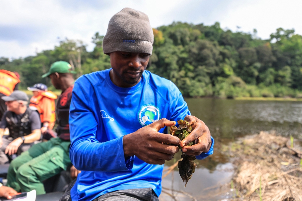 Thierry Aviti, head of freshwater habitats and researcher at the University of Douala, looks for weevils in a clump of salvinia on Lake Ossa, in Dizangue, on December 10, 2024. (Photo by Daniel Beloumou Olomo / AFP)