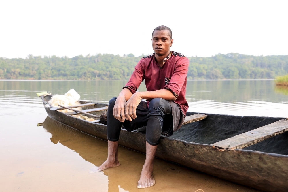 Fisherman Thierry Bossambo, 38, poses for a portrait while sitting on his boat, in Dizangue, on December 11, 2024. (Photo by Daniel Beloumou Olomo / AFP)