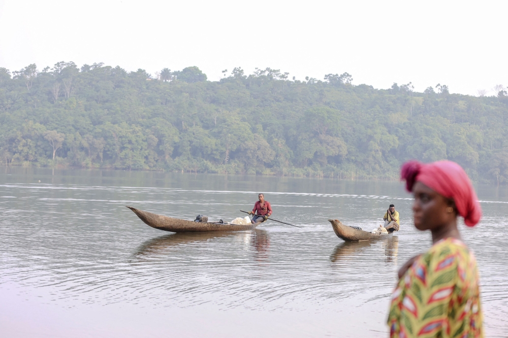 Fishermen bring their pirogues to the shores of Lake Ossa to sell their fish, in Dizangue, on December 11, 2024. (Photo by Daniel Beloumou Olomo / AFP)