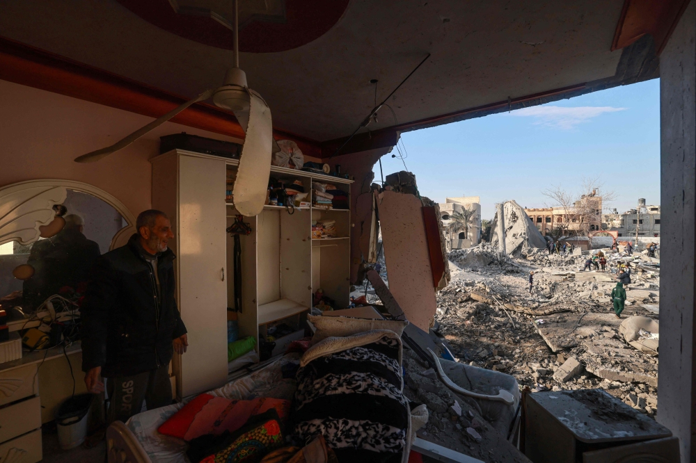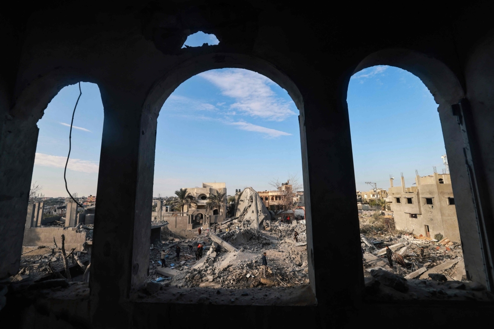 Palestinians stand amidst the rubble of buildings destroyed in Israeli bombardment in Rafah in the southern Gaza Strip on January 25, 2024.