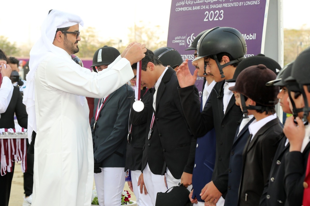 H E Sheikh Joaan bin Hamad Al Thani presents medal to a rider.