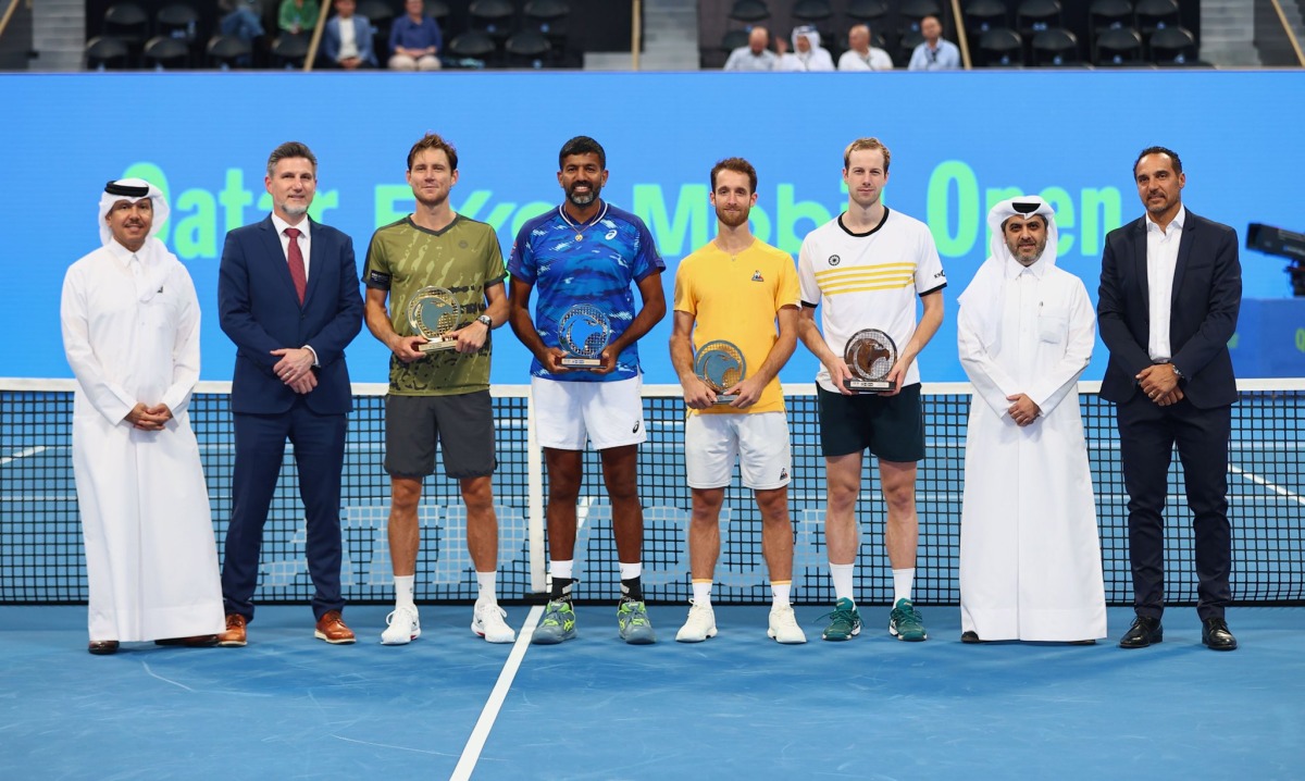 Qatar Tennis, Squash and Badminton Federation Secretary-General Tariq Zainal, Qatar ExxonMobil Open 2023 Tournament Director Karim Alami, Vice-President of Governmental and Public Affairs at ExxonMobil Saleh Al Mana with the doubles winners Rohan Bopanna and Matthew Ebden and runners-up Constant Lestienne and Botic van de Zandschulp.
