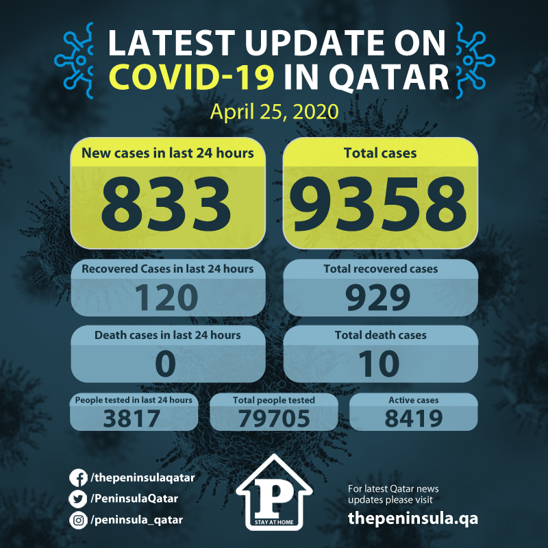 The total number of positive COVID-19 cases recorded in Qatar till now stands at 9358 and there are 8419 active cases under treatment. So far 10 people have died in Qatar due to the virus infection. Ministry conducted 3817 tests in last 24 hours taking the total tests done so far to 79705 tests.