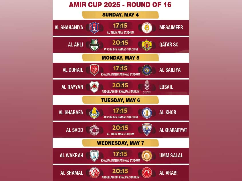 The Round of 16 stage will kick off on May 4 with Al Shahania facing Mesaimeer, followed by the clash between Al Ahli and Qatar SC. Al Ahli enjoyed an impressive QSL season, finishing fourth.