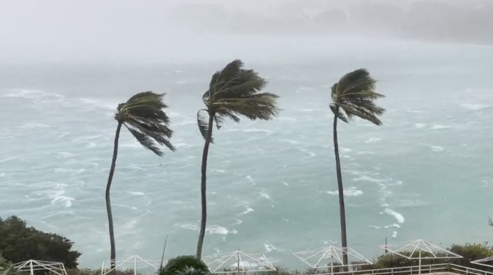 This video grab from the Twitter page of James Reynolds @EarthUncutTV shows tropical storm force winds blowing across Tumon Bay, Guam on May 24, 2023.