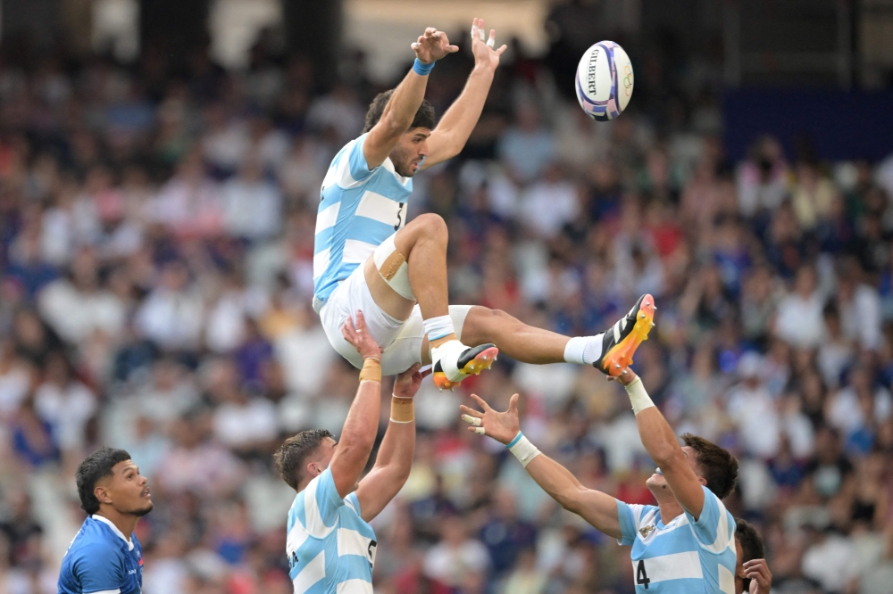 Argentina's German Schulz (top) reaches to catch the ball during the men's pool B rugby sevens match between Argentina and Samoa during the Paris 2024 Olympic Games at the Stade de France in Saint-Denis on July 24, 2024. (Photo by Carl De Souza / AFP)
