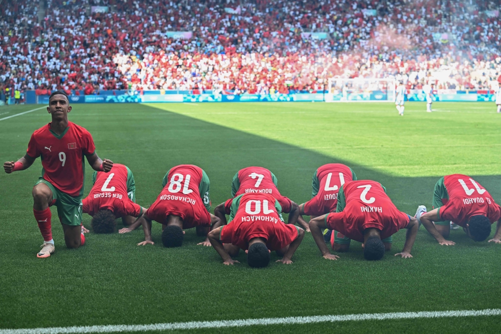 Morocco's forward #09 Soufiane Rahimi (left) kneels as he celebrates after scoring his team's first goal, as his teammates touch their forehead to the ground in the men's group B football match between Argentina and Morocco during the Paris 2024 Olympic Games at the Geoffroy-Guichard Stadium in Saint-Etienne on July 24, 2024. (Photo by Arnaud Finistre / AFP)