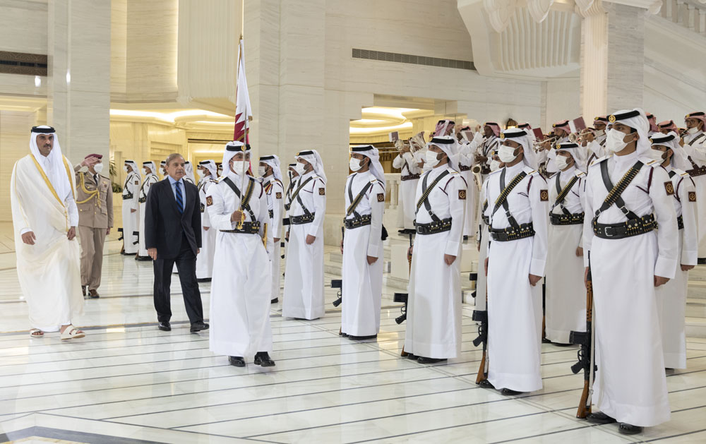 Amir H H Sheikh Tamim bin Hamad Al Thani and Prime Minister of Pakistan H E Shehbaz Sharif inspecting the guard of honour.