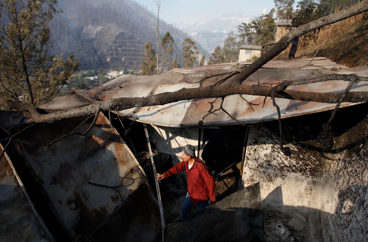 A man inspects the remains of a house burned by a bushfire on a hill in Quito on September 25, 2024. Photo by Galo Paguay / AFP