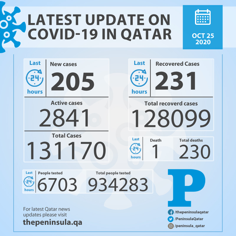 Doha: Ministry of Public Health (MoPH) today recorded 205 new cases of coronavirus (COVID-19) and 231 people recovered from the virus in the last 24 hours, bringing the total number of people recovered in Qatar to 128,099.