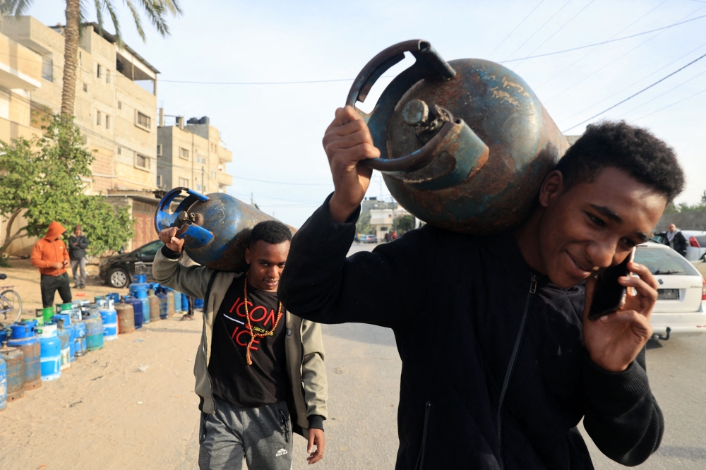 Men carry empty gas canisters to be filled with cooking gas from a tank that entered the Palestinian enclave on November 25, 2023. (Photo by Said Khatib / AFP)