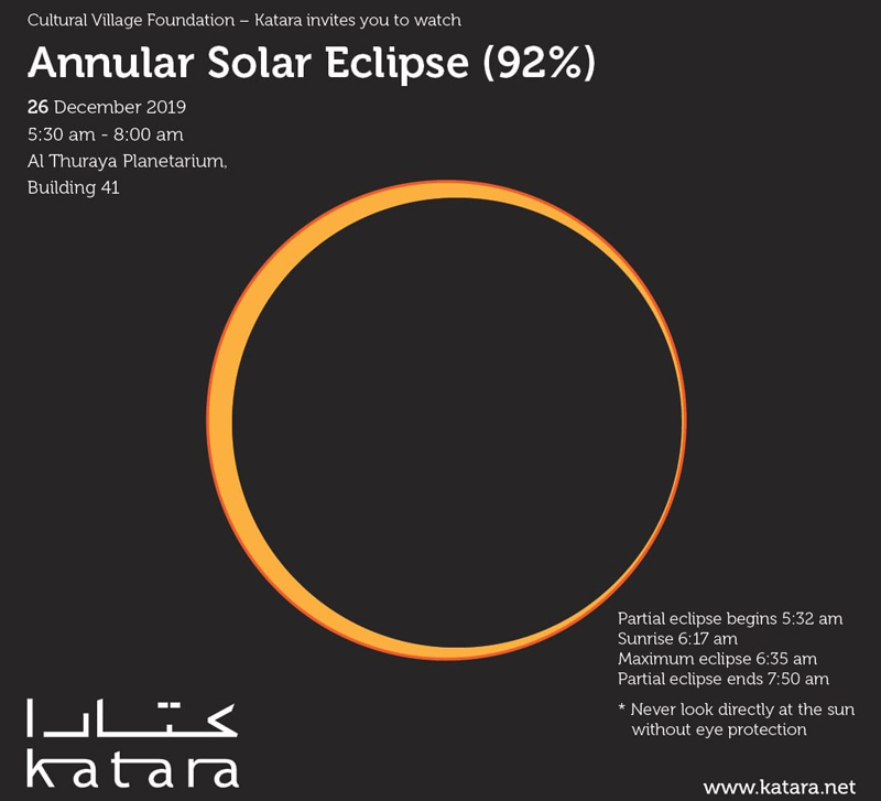 You can watch the rare solar eclipse tomorrow at the Al Thuraya Planetarium. Katara has invited public to the planetarium at Building 41 to watch the Annular Solar Eclipse, which is a very rare phenomenon. The partial eclipse will start at 5:32am and will end at 7:50am with the maximum eclipse expected at 6:35am.