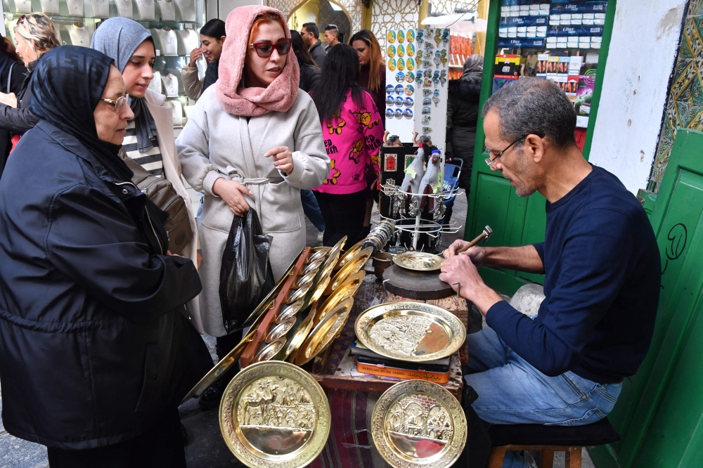 A Tunisian artisan displays a copper plate he is engraving to a tourist at his shop in the souks of the medina of Tunis on December 7, 2023. (Photo by Fethi Belaid / AFP)