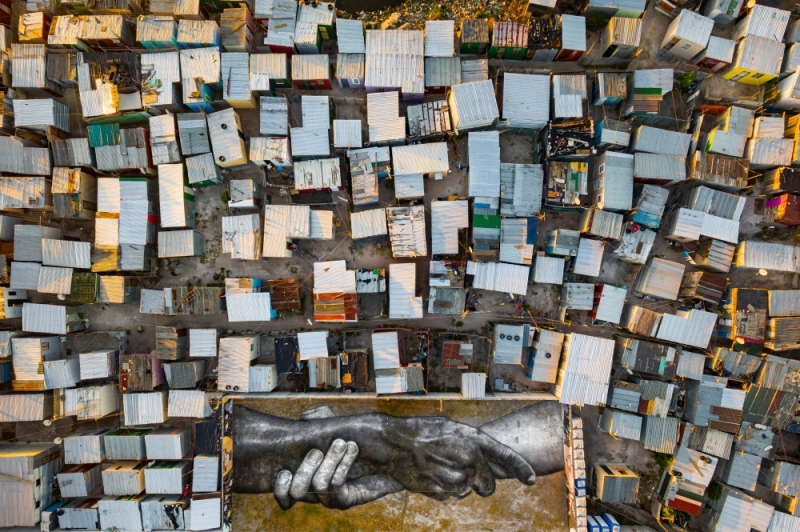 Guided by wooden pegs, Saype painstakingly builds up the final image of two hands clasping each other's forearms in the windswept corner of an old cement factory and surrounded by a sea of wooden and tin shacks.
