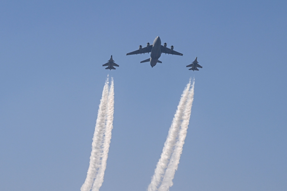 Indian Air Force C-17 Globemaster and SU-30 fighter jets fly past during India's 76th Republic Day parade in New Delhi on January 26, 2025.