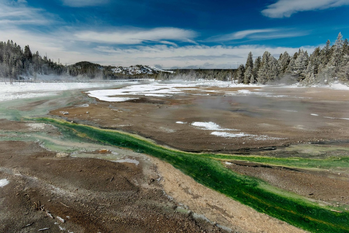 In Yellowstone, snow, even just an inch, means safety. A patch of bare ground in the otherwise snowy landscape reveals the presence of underground thermal activity. The ground over thermal features can be thin; it's best to avoid crossing it altogether rather than risk it giving way under your weight.