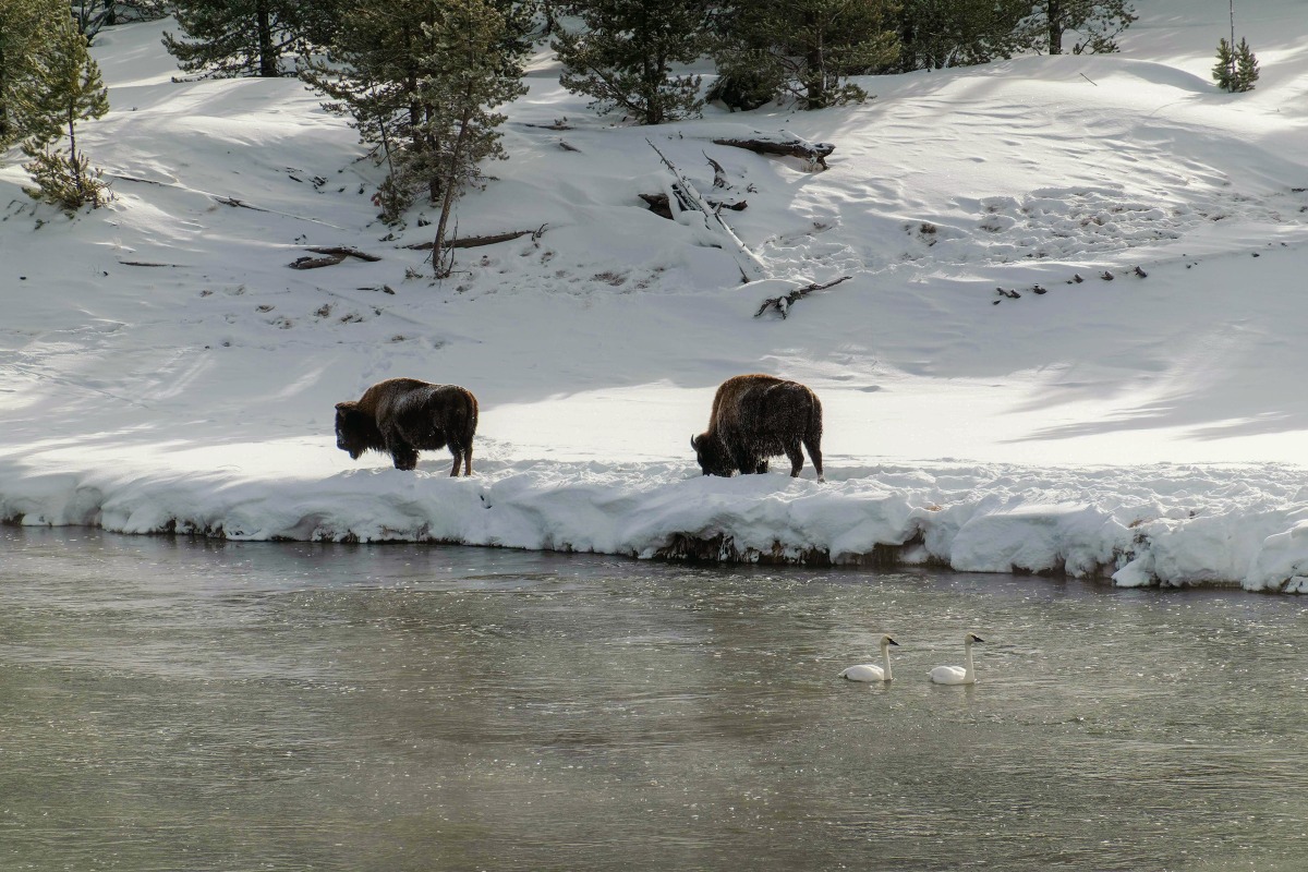 Farther up the river, we stop to watch bison on the far bank. Yellowstone is the only place in the United States where wild bison have lived continuously from prehistoric times to the present. (The park's population hit a nadir of about 23 of the animals in 1901; today, it aims for a population of about 5,000.) A pair of trumpeter swans floats by in front of them.
