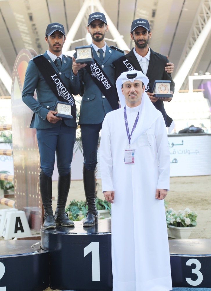 The podium winners of the Longines Hathab Medium Tour, Hussain Saeed Haidan, Ghanim Nasser Al Qadi and Rashid Towaim Al Marri with Omar Al Mannai, Event Director, Commercial Bank CHI Al Shaqab Presented by Longines.