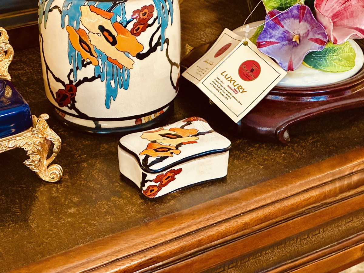 A pair of a ring box and a jar from 1917 at Esam Alhijji's booth at Good Finds Market.
