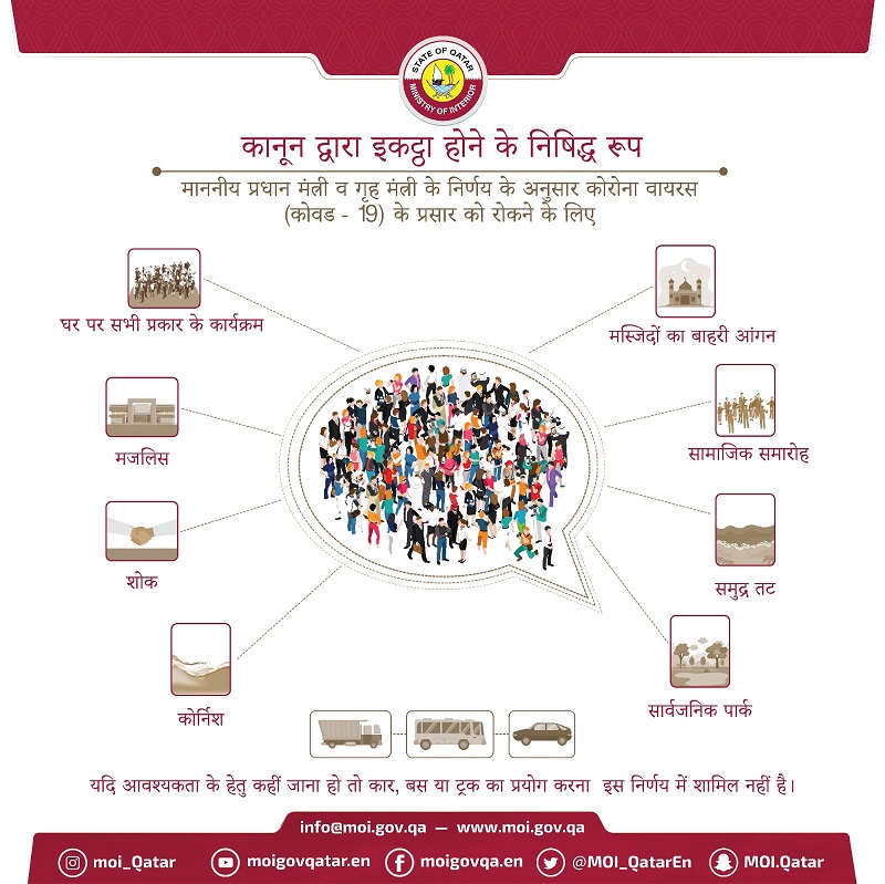 “The prohibited forms of gathering include social functions at homes, majlis, mourning, Corniche, courtyards of mosques, social gatherings, beaches and public parks,” the Ministry said.