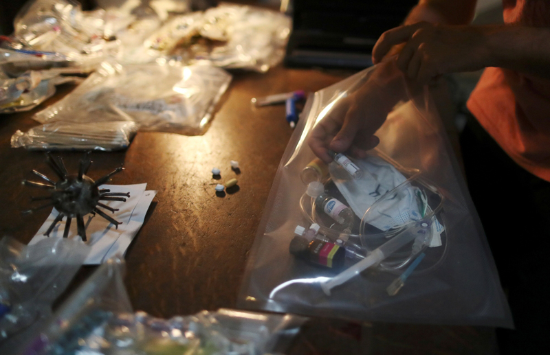 Facundo Mineldin, assistant to Argentine artist Marcelo Toledo (not pictured), arranges a bag with empty vials of the coronavirus disease (COVID-19) vaccines, and other medical supplies that will be part of the "Museum of the After", at Toledo's workshop in Buenos Aires, Argentina March 4, 2021. Picture taken March 4, 2021. REUTERS/Agustin Marcarian