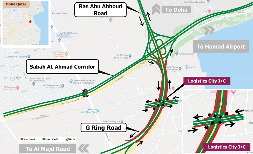 Ashghal said that the Logistics City Interchange will link the east and west Free Zone directly to Hamad International Airport, G-Ring Road, and surrounding roads such as Ras Abu Abboud Street, Airport Road and Sabah Al Ahmad Corridor. The interchange is also integrated with Doha Metro to facilitate access to Free Zone station.