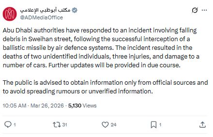 Abu Dhabi authorities have responded to an incident involving falling debris in Sweihan street, following the successful interception of a ballistic missile by air defence systems.