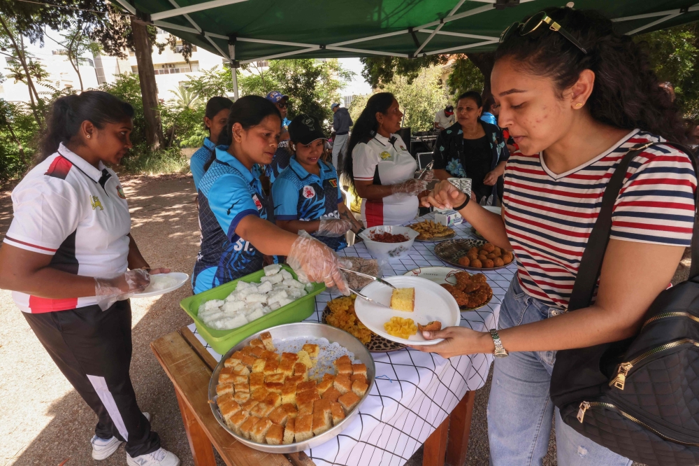 "Sunday we are so happy... We eat together, we laugh together," said cricketer Pradeepa Silva, a 42-year-old Sri Lankan, as she and her teammates prepared coconut rice and other traditional food nearby to share.