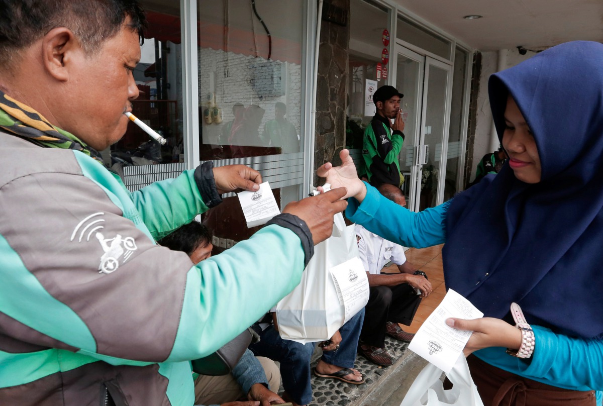 A Go-Jek driver shows boxes with food for his customer in front of a food stall in Jakarta, Indonesia, July 13, 2017. Reuters/Beawiharta