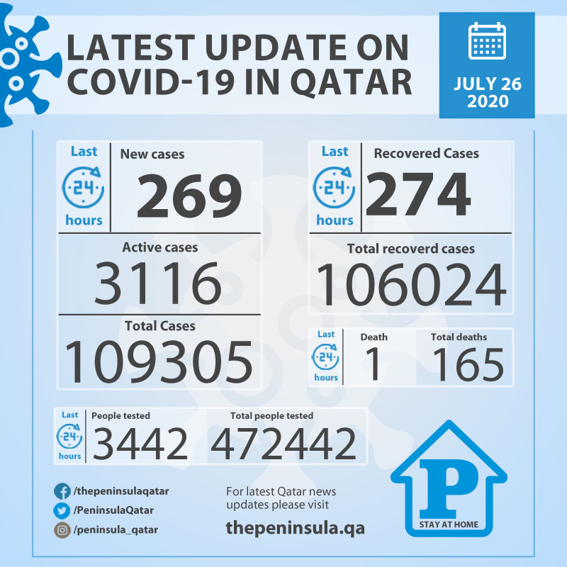 Ministry of Public Health today recorded 269 new cases of coronavirus (COVID-19) and 274 people recovered from the virus in the last 24 hours, bringing the total number of people recovered in Qatar to 106024. The Ministry also announced one death due to Covid-19.