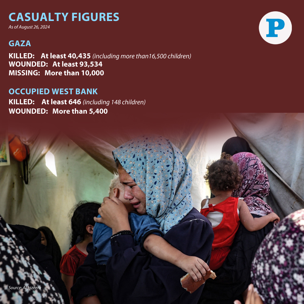 Gaza: The number of casualties of the ongoing Israeli onslaught on the Gaza Strip since October 7, 2023 has surged to 40,435 martyrs and 93,534 wounded, mostly women and children.