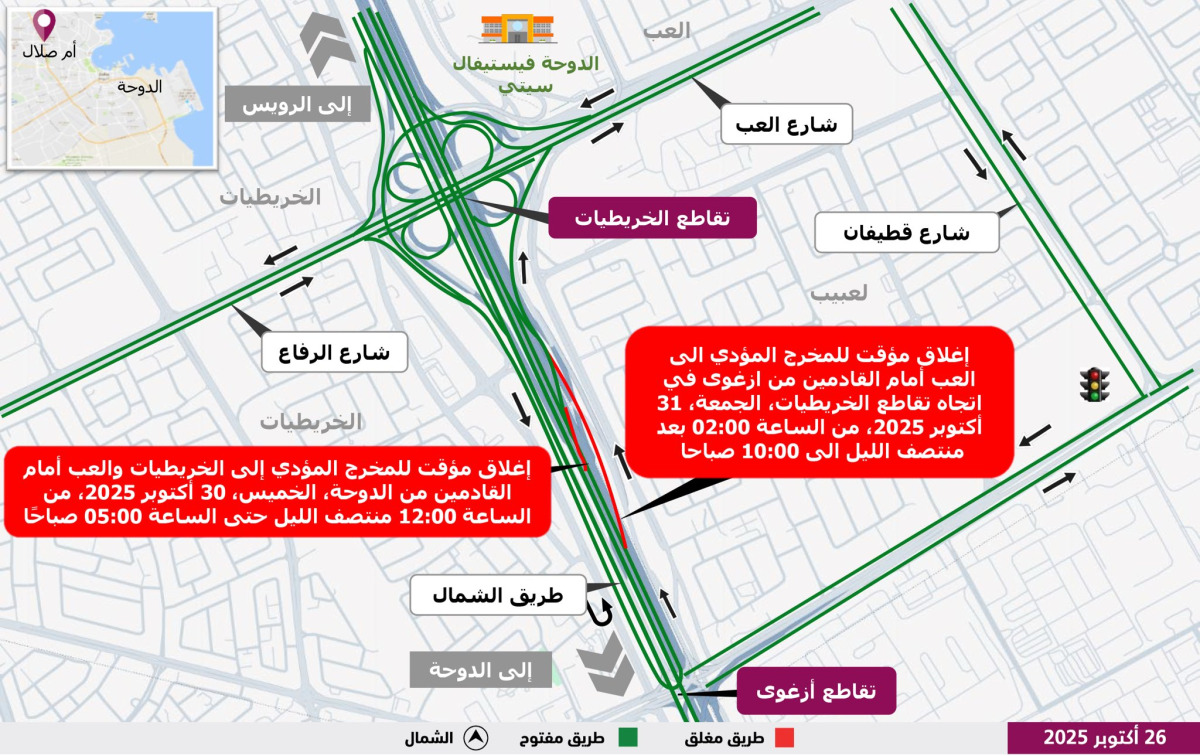 Doha, Qatar: The Public Works Authority, Ashghal, announced a temporary traffic closure of the Al Kharaitiyat Interchange for the exit leading to Al Kharaitiyat and Al Ebb, affecting traffic coming from Doha.