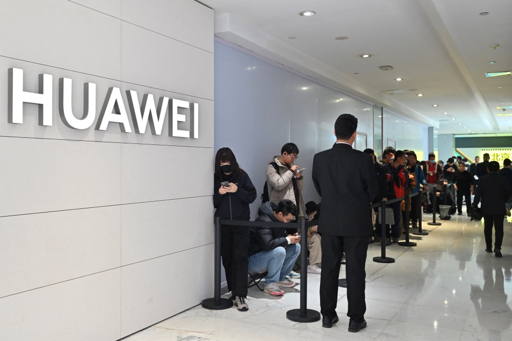 People queue outside a Huawei store at the Wangfujing shopping area in Beijing on November 26, 2024, to preorder Huawei's new Mate 70 mobile phone. (Photo by Adek Berry / AFP)