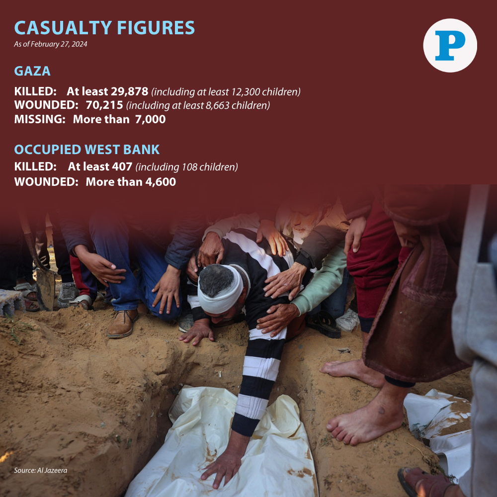 Photo shows Palestinians mourning as they bury their dead following overnight Israeli air strikes, at a cemetery in east Khan Yunis in the southern Gaza Strip on February 26, 2024.(Photo by Said Khatib / AFP)