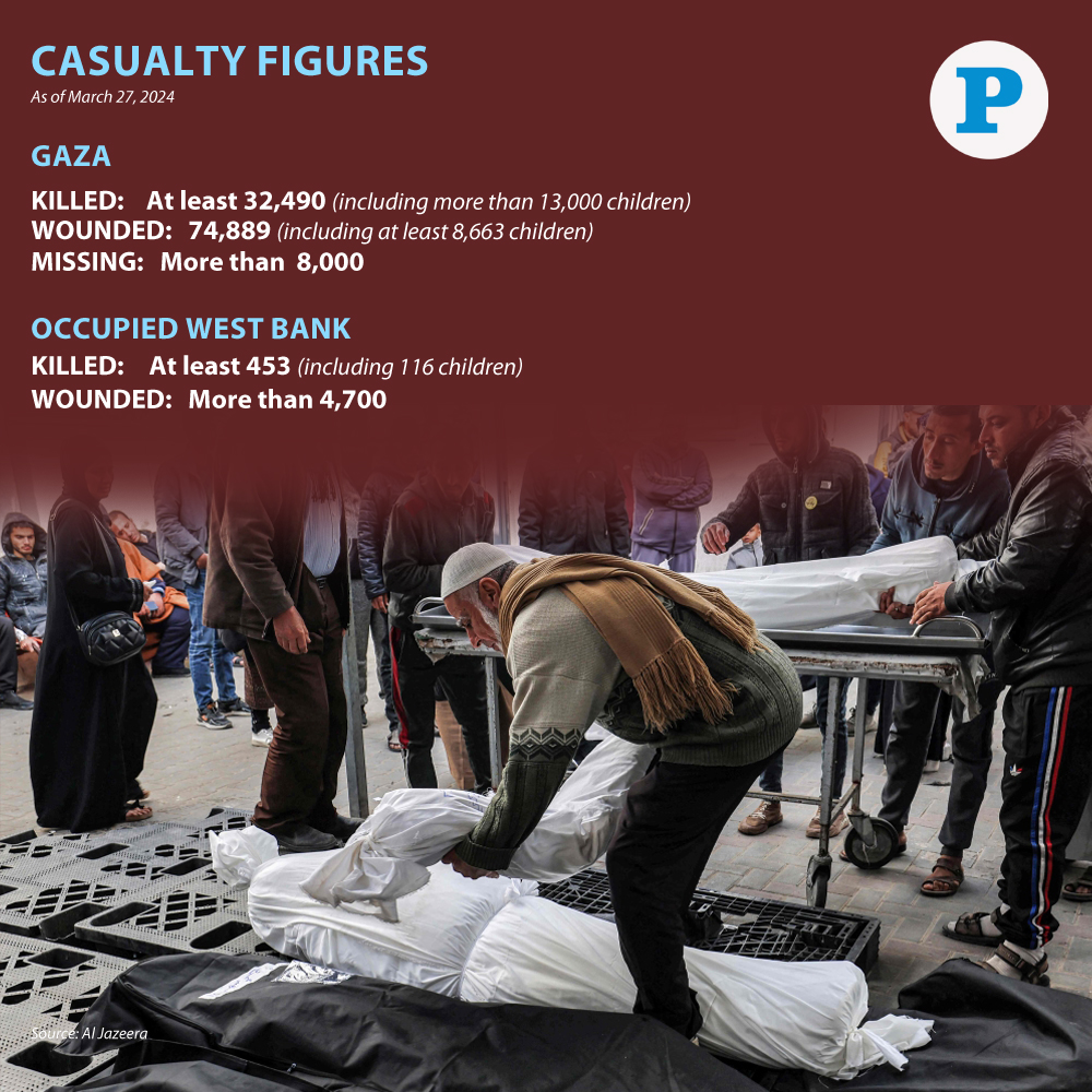 Gaza: The ongoing Israeli aggression on the Gaza Strip, since October 7, has killed 32,490 Palestinians and injured 74,889 others, the majority of whom are children.