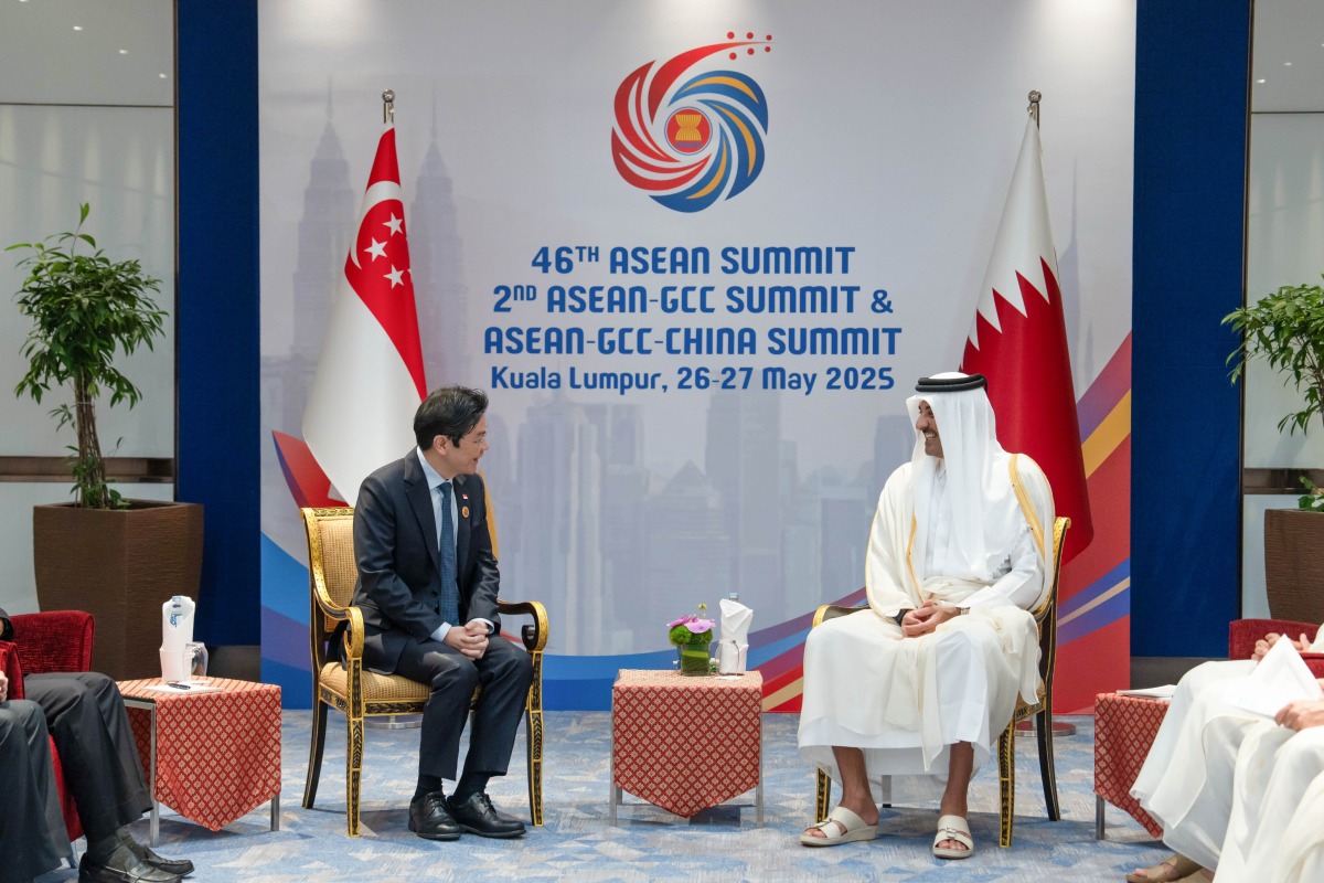 Doha, Qatar: The Amir His Highness Sheikh Tamim bin Hamad Al-Thani met with His Excellency Lawrence Wong, Prime Minister of the Republic of Singapore, on the sidelines of the second summit of the Gulf Cooperation Council (GCC) and the Association of Southeast Asian Nations (ASEAN), held at the Kuala Lumpur Convention Centre.