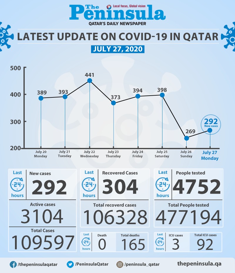 Ministry of Public Health today recorded 292 new cases of coronavirus (COVID-19) and 304 people recovered from the virus in the last 24 hours, bringing the total number of people recovered in Qatar to 106328.