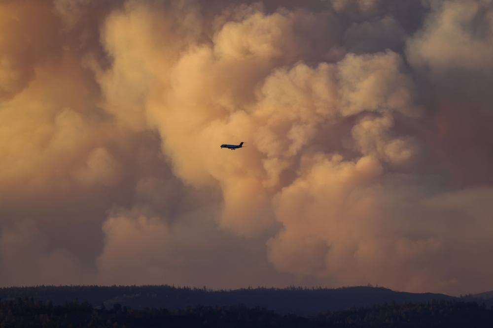 A firefighting jet passes as a massive pyrocumulus cloud rises from the Park Fire. DavidMcNew/Getty Images/AFP