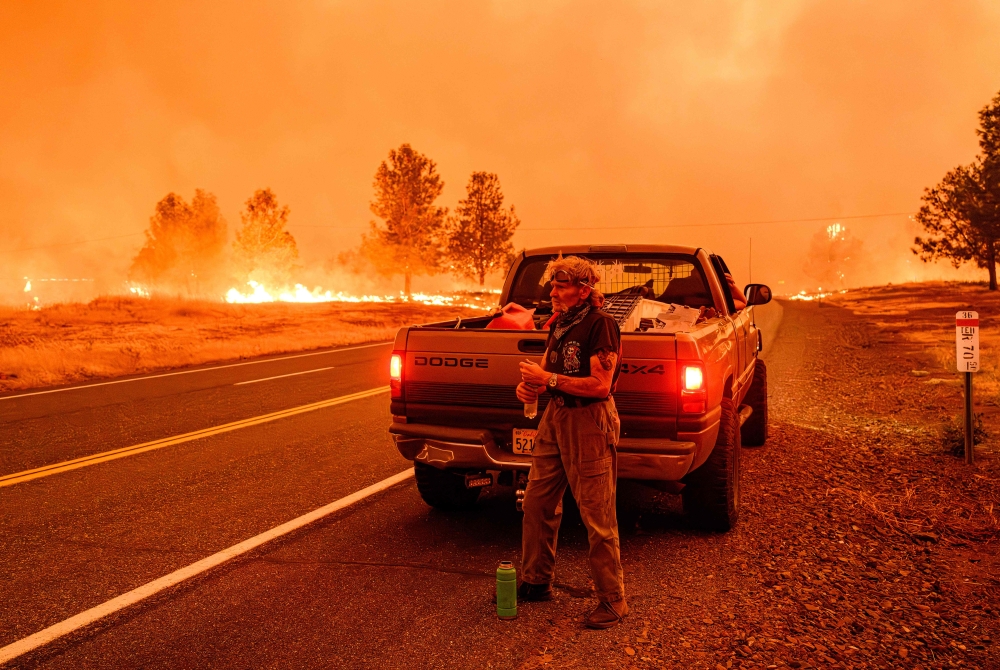 Resident Grant Douglas takes a drink of water while evacuating his wife and dog on July 26, 2024. (Photo by Josh Edelson / AFP)