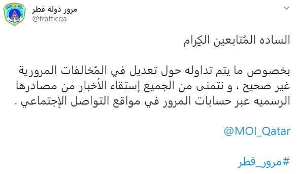 The department in a tweet in Arabic mentioned (roughly translates to), "Regarding what is being circulated about an amendment in traffic violations is incorrect, and we hope that everyone gets news from correct sources through official accounts on social networking sites."