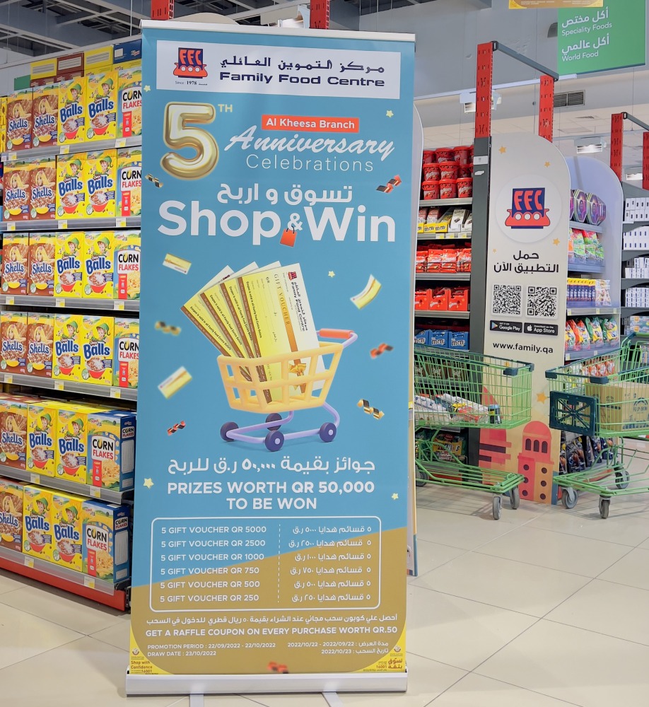 On the occasion of the branch celebrating its anniversary, the outlet has started a ‘Shop and Win’ campaign that began on September 22 and will last until October 22, 2022. This promotion is valid only at the Al Kheesa branch of the Family Food Centre.