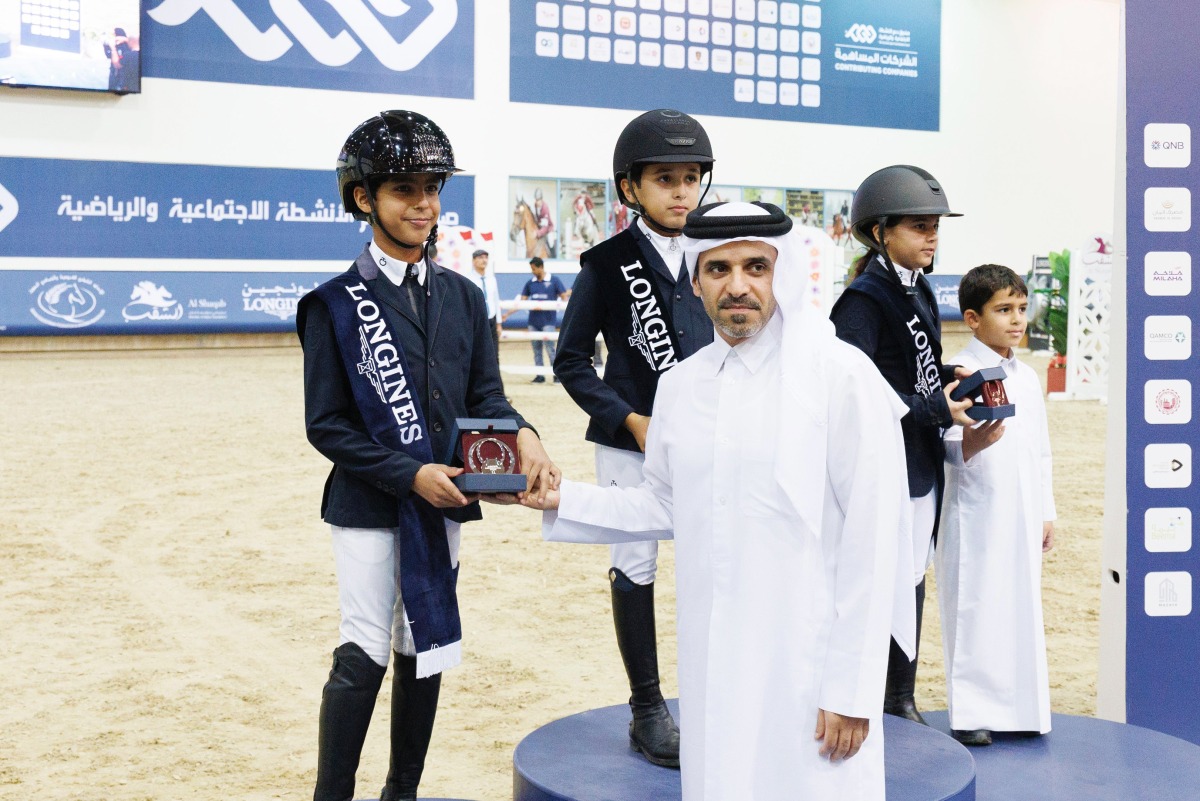 QEF President Al Darwish presents awards to the podium winners of the Future Riders 60cm event, Fahad bin Nasser Al Thani, Nasser Hamad Al Thani and Hissa Al Al Jaber.