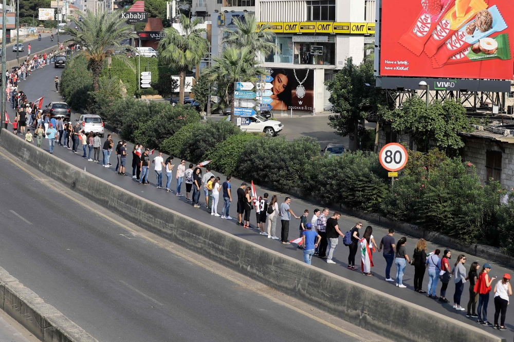 Beirut: Tens of thousands of Lebanese protesters were attempting to form a human chain running across the entire country on Sunday to symbolise newfound national unity.