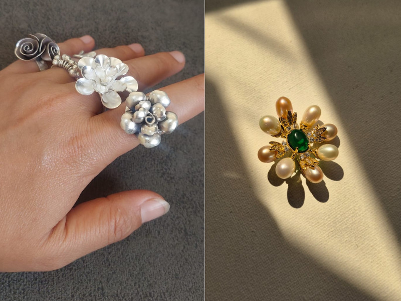 Handmade silver ring and freshwater pearl brooch.