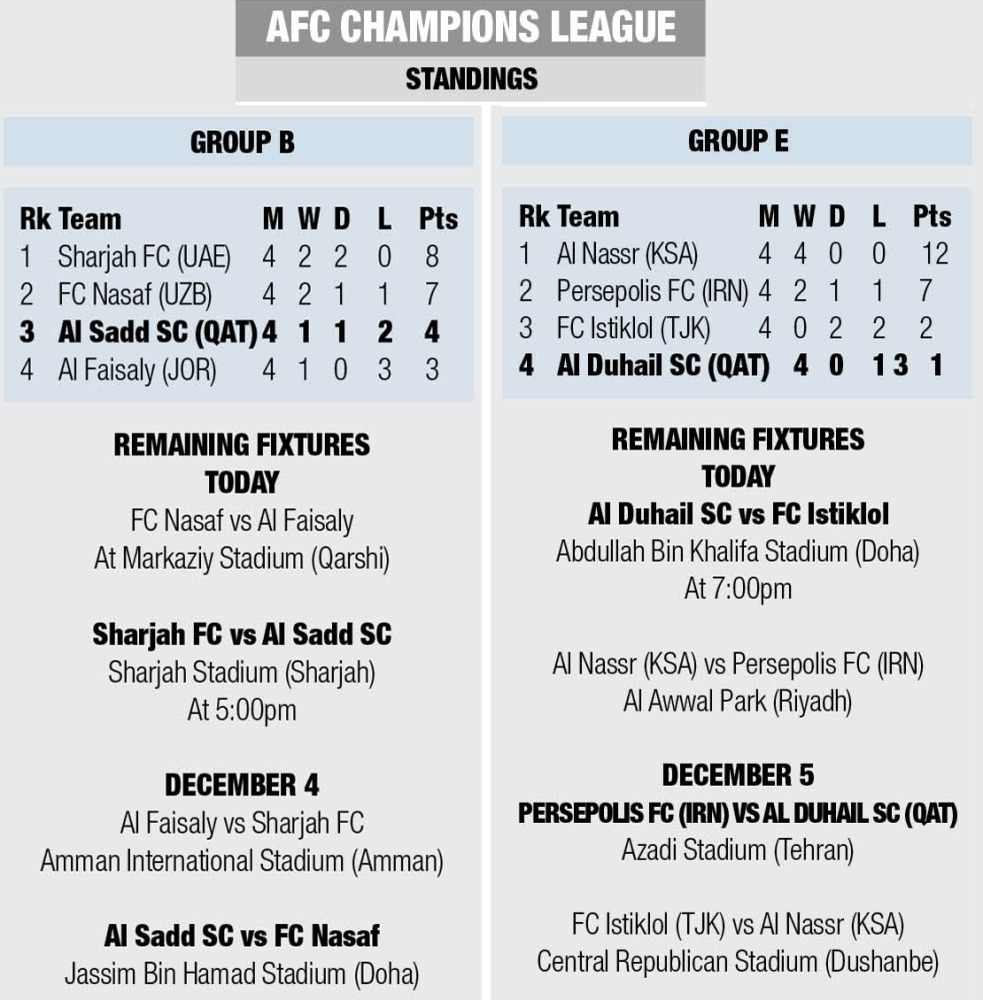 They will host Tajikistan’s FC Istiklol (2 points) at Abdullah Bin Khalifa Stadium today in a battle of bottom-placed sides of Group E, led by Saudi Arabia’s Al Nassr with perfect 12 points. Persepolis FC are second with seven points.
